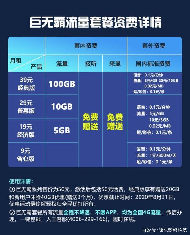 巨无霸系列是全民优打和中国联通推出的产品,可能全民优打的名字大家不熟悉,其实它也是最早的一批虚拟运营商之一。巨无霸系列月租从9—39元不等,性价比最高的还是那个39元的套餐,最大100GB的高速4G流量,相比米粉卡和大王卡用多少付多少的规则,这个直接规定了范围。100G一个月想全用完也不是容易事,就是天天看视频,玩游戏也不一定能用完。39元月租也锁定了每月的花销。